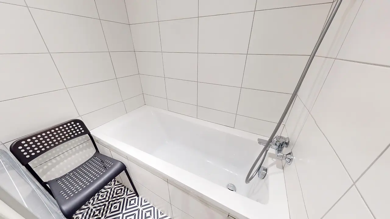 Cet appartement de 4 pièces est composé d'un salon équipé d'un canapé, d'un fauteuil, d'une table à manger ainsi que d'une télévision, de trois chambres, d'une cuisine et d'une salle de bains avec baignoire et douche.