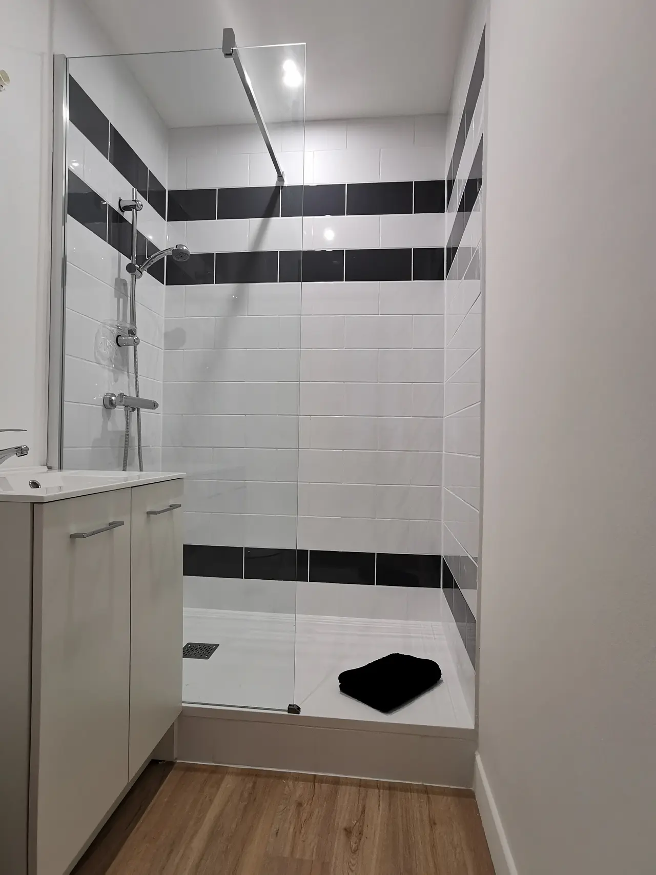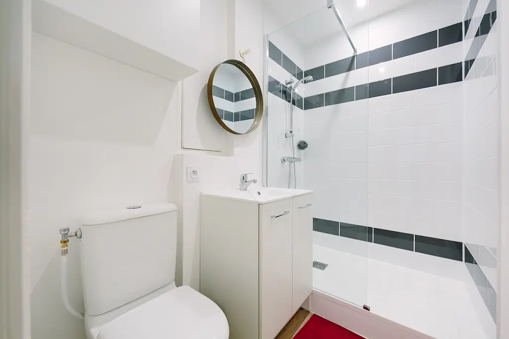 La salle d’eau dispose d’une grande douche, d’un meuble vasque avec un miroir ainsi que d’un WC.