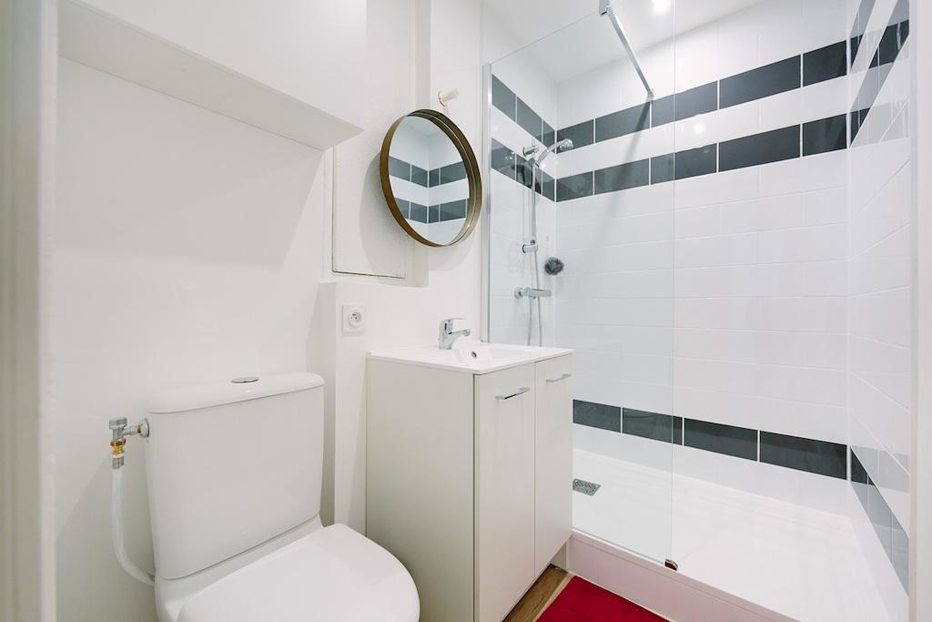 La salle d’eau dispose d’une grande douche, d’un meuble vasque avec un miroir ainsi que d’un WC.