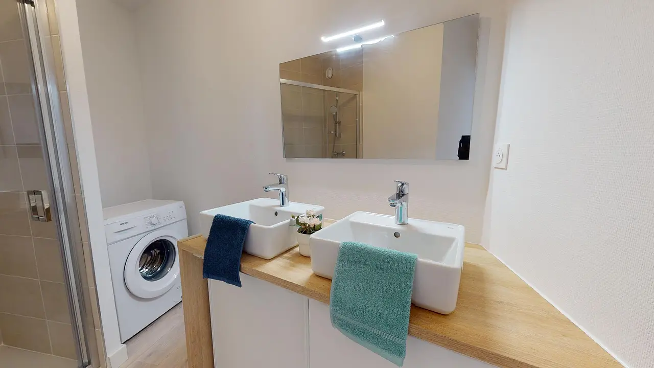 Une salle de bain avec grande cabine de douche, meuble vasque et machine à laver ainsi que des WC séparés viennent compléter ce logement.