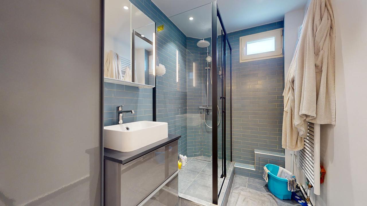 La salle d'eau dispose d'un meuble vasque avec miroir, une grande douche ainsi que des rangements.