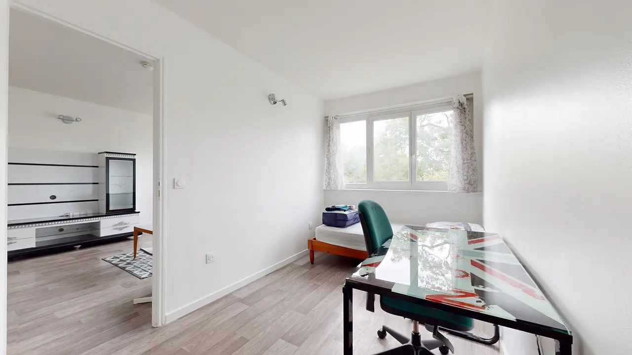 La chambre est équipée d'un lit simple, d'un bureau et d'une penderie.