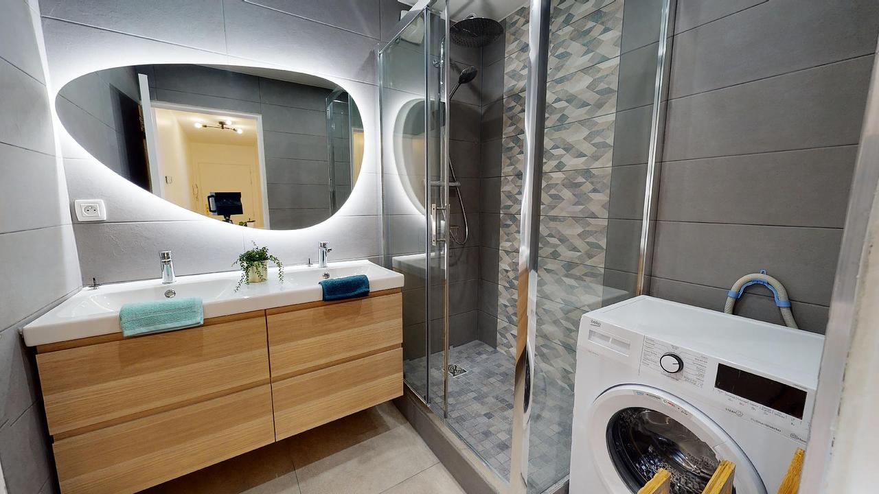 La salle de bain est équipée avec un grand miroir, un meuble double vasque, une belle douche ainsi qu'une machine à laver.