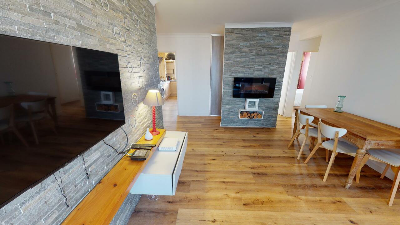 Grand salon lumineux aménagé (canapé d’angle, cheminée, TV, ne table à manger, etc)