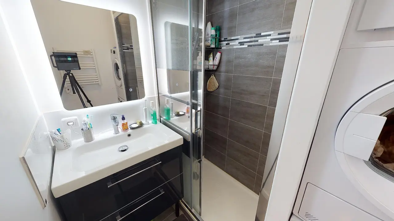 Une salle de bain avec douche, machine à laver, sèche linge et meuble vasque ainsi que des WC séparés viennent compléter ce logement.