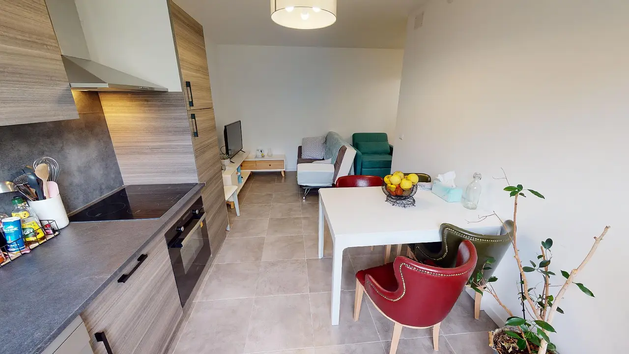 Cette colocation comporte une pièce de vie avec un coin salon : canapé, fauteuil, TV et une cuisine ouverte totalement équipée : lave vaisselle, four, frigo, plaques de cuisson, rangements, etc.