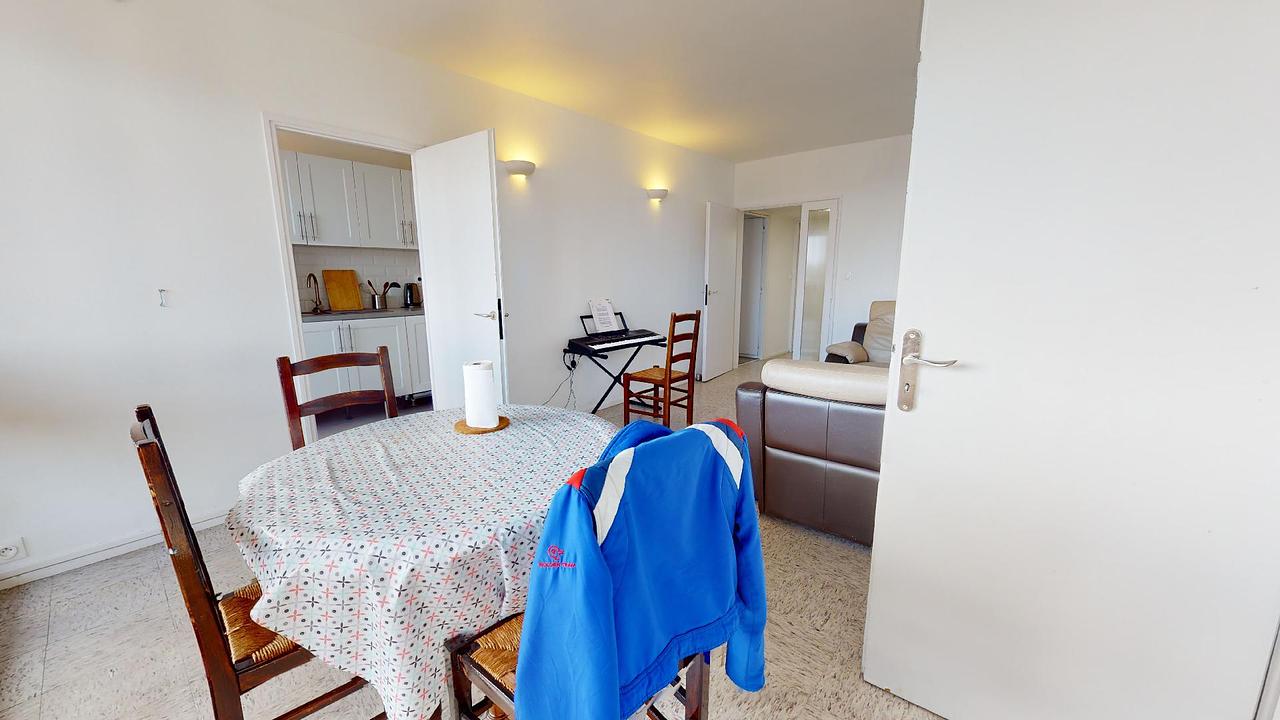 Le salon est très lumineux, il dispose d'un canapé avec un fauteuil, une table avec quatre chaises, idéal pour partager des repas entre colocataires. Cette pièce a un accès direct sur un balcon partagé avec la cuisine. Cette dernière est équipée d'un réfrigérateur avec congélateur, un four, des plaques à induction avec une hotte, une bouilloire, un évier, une poubelle et de nombreux rangements.
