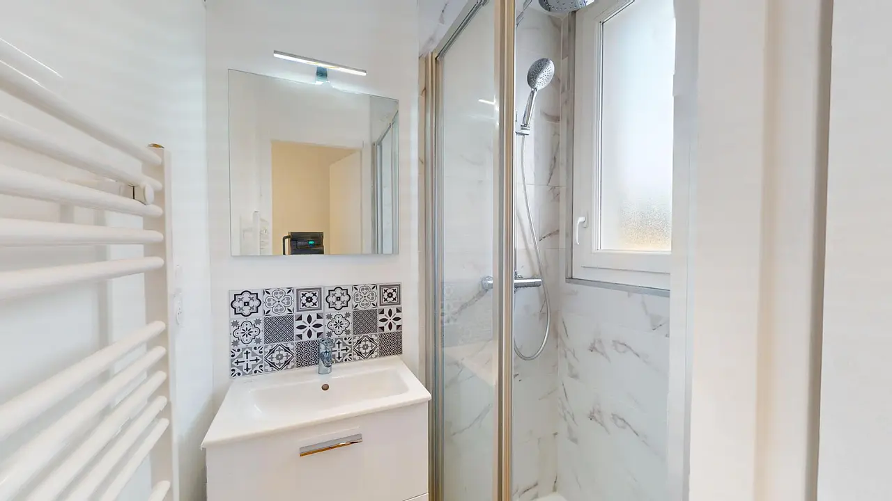 2 salles d'eau avec une douche, un meuble vasque ainsi qu'un sèche-serviette dans chacune
