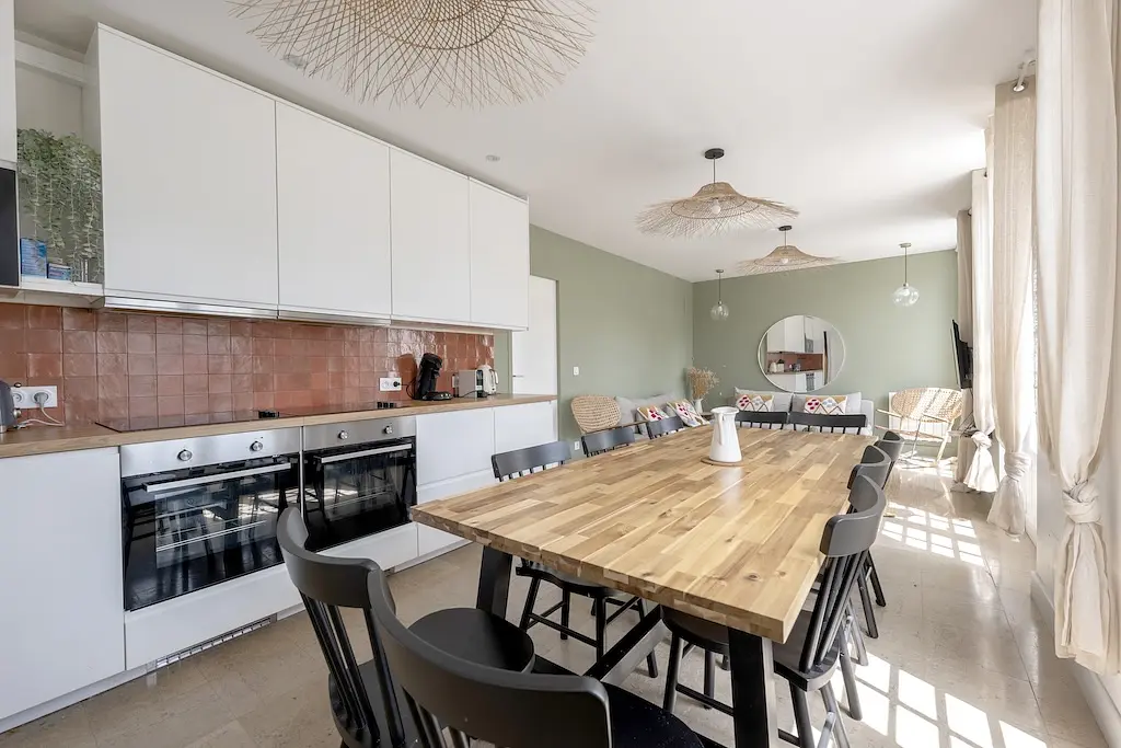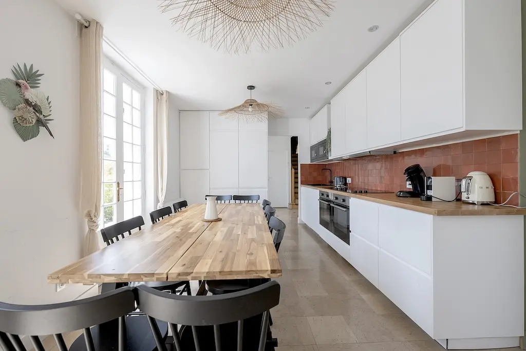 La maison pour 10 belles chambres comprend une cuisine entièrement équipée (table pour 10 pers, plaque XXL, 2 fours, plusieurs réfrigérateurs, congélateur, lave-vaisselle), un séjour/salon, 4 WC, une buanderie avec 2 lave-linge/sèche-linge, une grande table de repas extérieur dans le jardin. Toutes les pièces communes donnent sur le jardin !