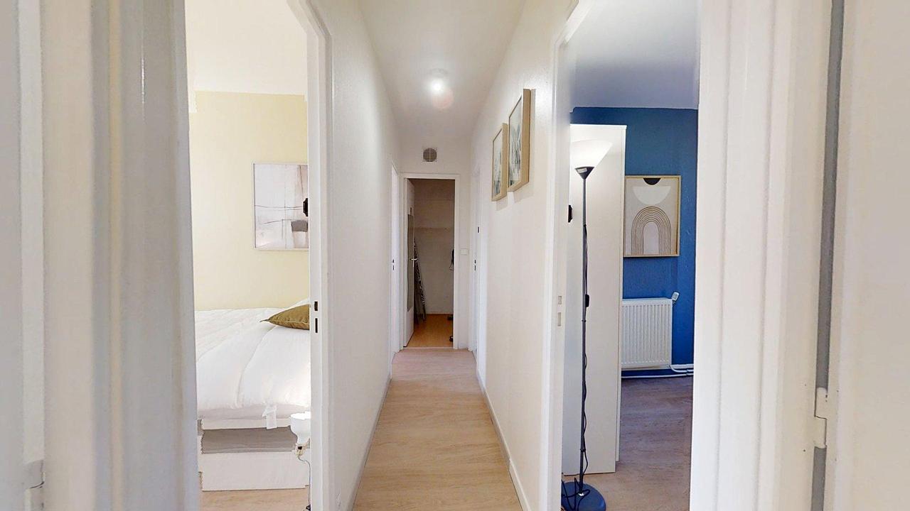 L’appartement comprend six chambres, chacune aménagée avec soin. Elles bénéficient d’un lit confortable, d’un bureau avec chaise, de rangements et d’une décoration contemporaine.