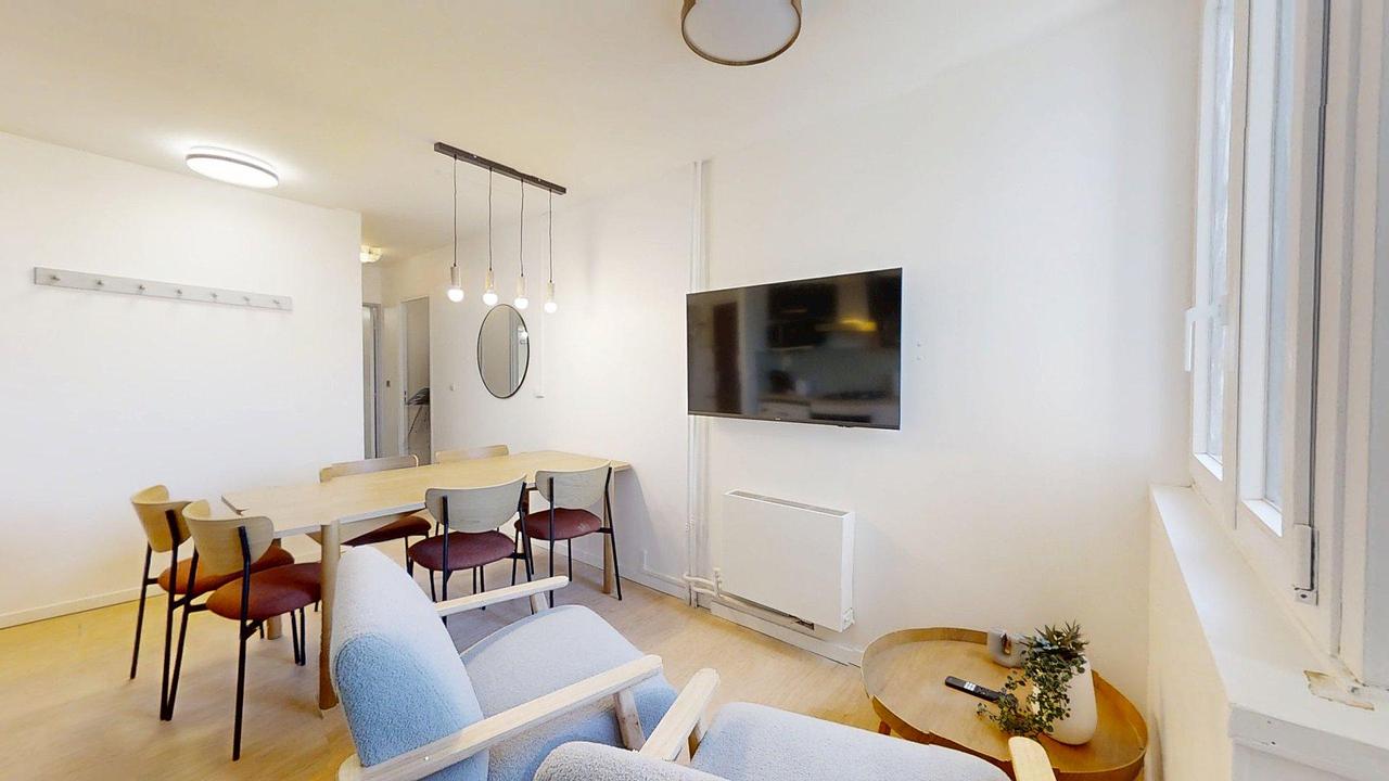 Cette colocation de 6 offre une grande pièce de vie confortable et lumineuse, aménagée avec un coin salon doté d’une télévision murale, de fauteuils cosy et d’une table basse. Un espace repas convivial accompagne l’ensemble avec une grande table et plusieurs chaises, idéal pour partager des moments entre colocataires.