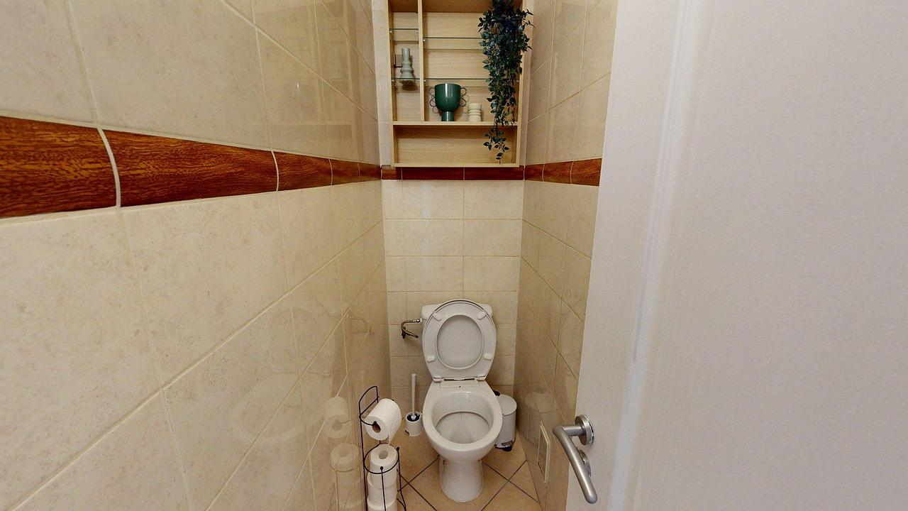 La salle d’eau, moderne et fonctionnelle, dispose d’une douche à l’italienne, d’un meuble vasque avec miroir, d’un sèche-serviettes ainsi que d’une machine à laver et de rangements. Les WC sont séparés, apportant un confort supplémentaire au quotidien.