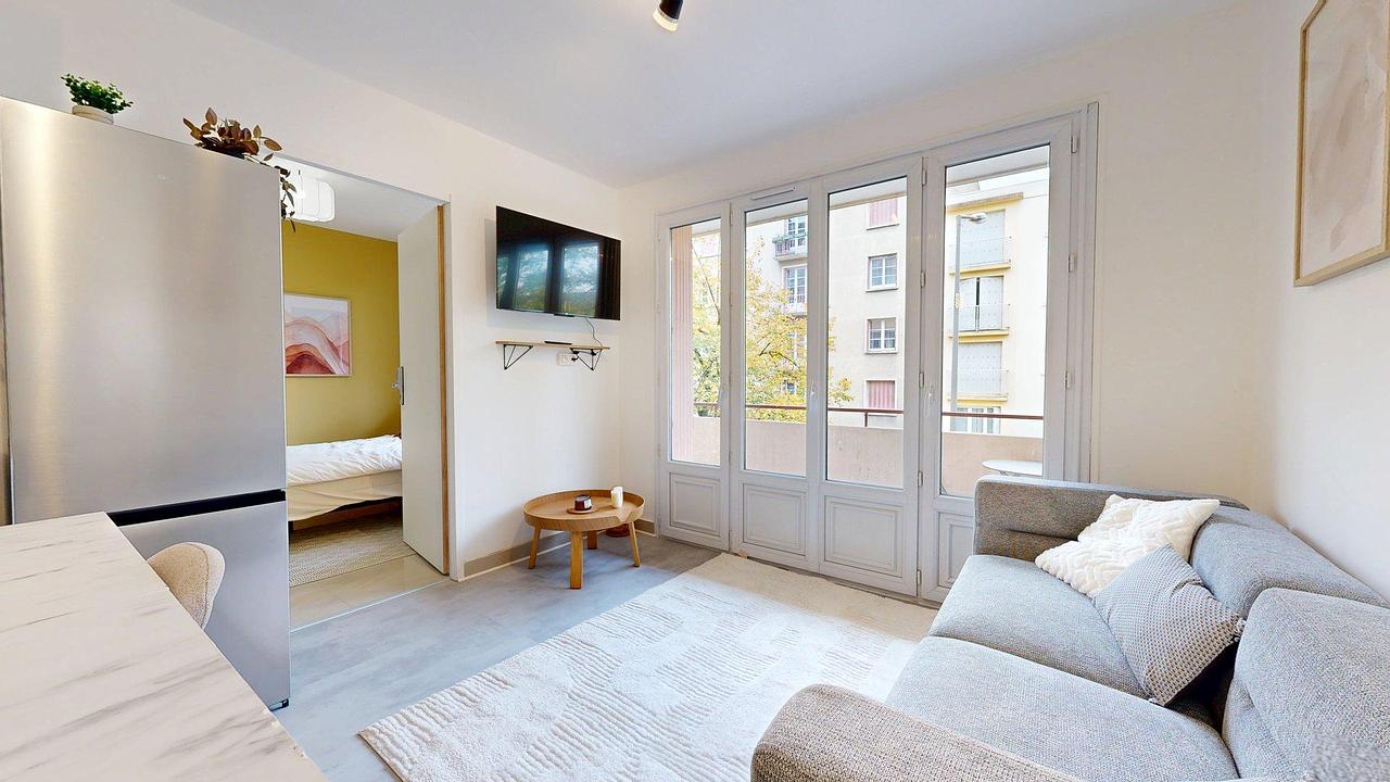 Entièrement rénové et décoré avec soin, ce bel appartement traversant propose un espace de vie lumineux et convivial. Le séjour, aménagé avec un canapé confortable et une décoration moderne, s’ouvre sur une cuisine ouverte au design contemporain.