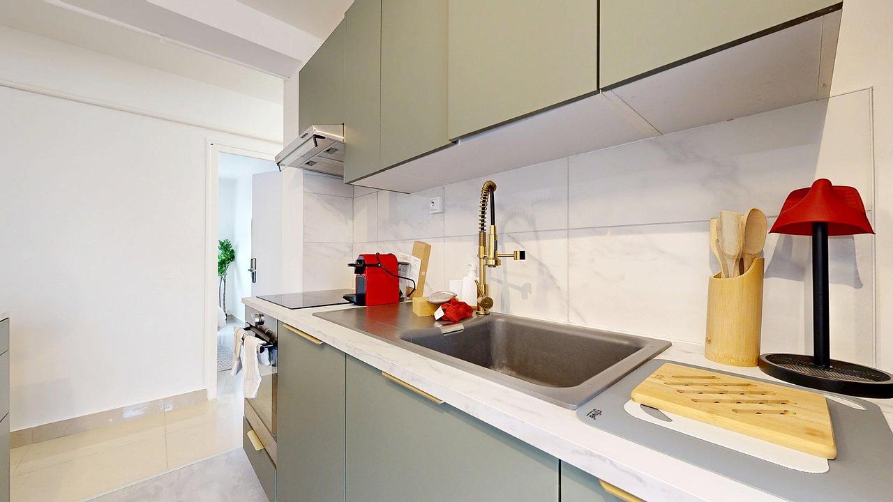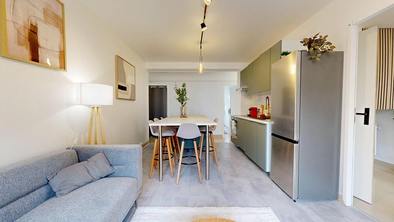 Entièrement rénové et décoré avec soin, ce bel appartement traversant propose un espace de vie lumineux et convivial. Le séjour, aménagé avec un canapé confortable et une décoration moderne, s’ouvre sur une cuisine ouverte au design contemporain.