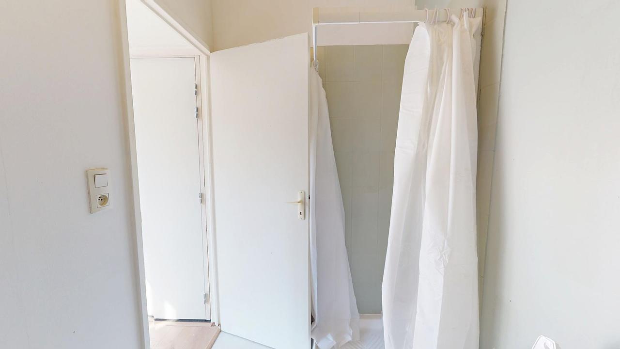 La salle d'eau se compose d'une douche, d'un lavabo avec un miroir, d'un meuble de rangements et d'un WC.