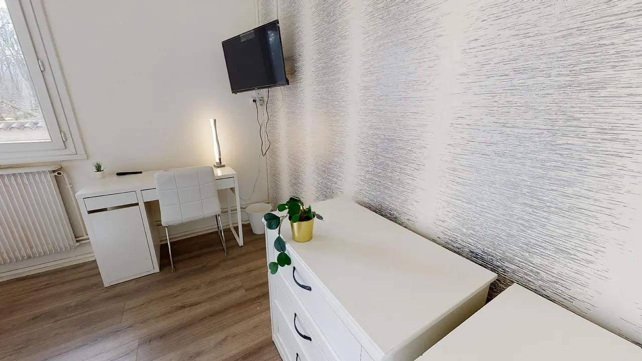La grande chambre de 12 m2, est entièrement meublée avec un lit double, un bureau et sa chaise, 2 commodes très pratiques pour ranger ses affaires et une télévision privative.
