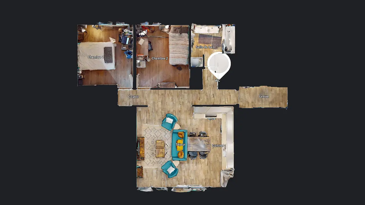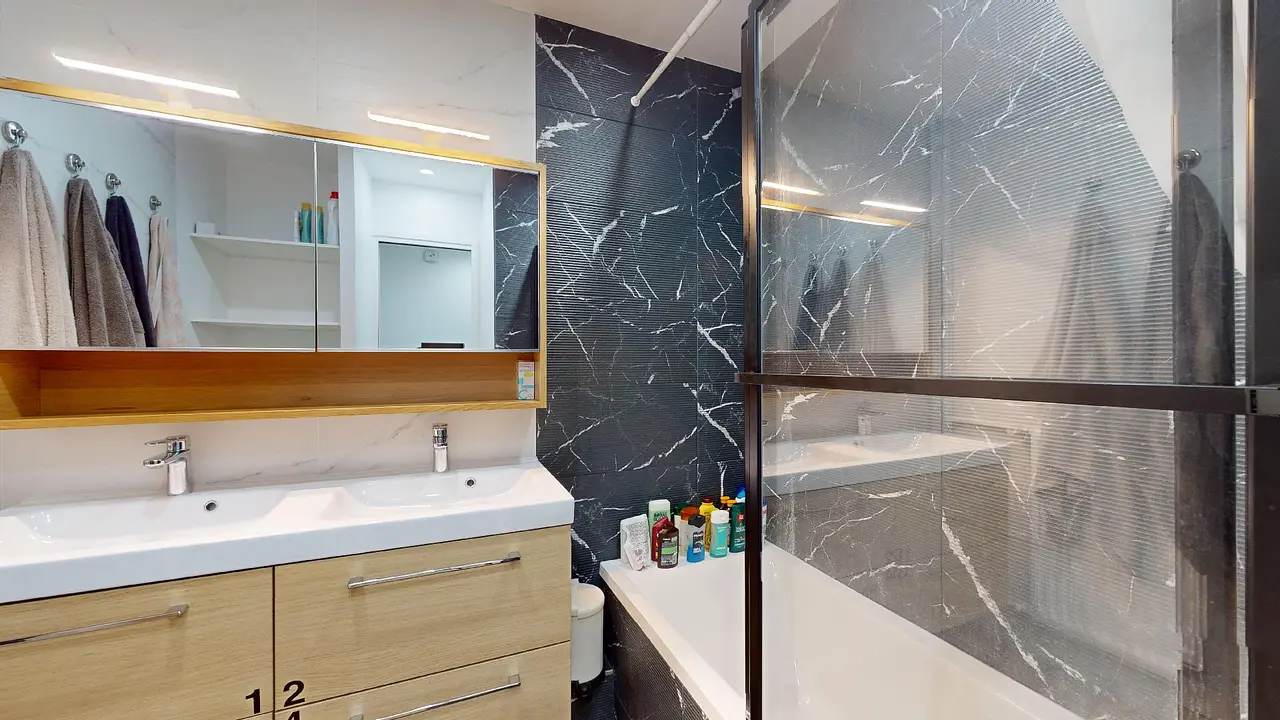 L'appartement se compose d'une entrée charmante, équipée d'un placard, qui conduit à la première des chambres. À la suite de cette entrée, un couloir vous guide vers les toilettes, la salle de bain (avec baignoire et meuble double vasque) et la pièce de vie. Cette dernière se divise en deux espaces distincts :