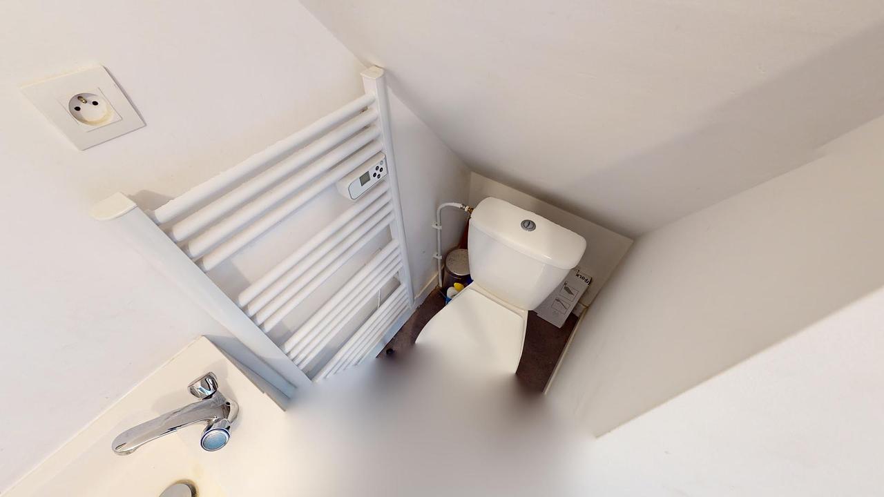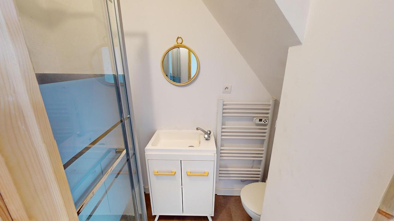 Une salle de bain avec douche, meuble vasque et WC vient compléter ce studio.