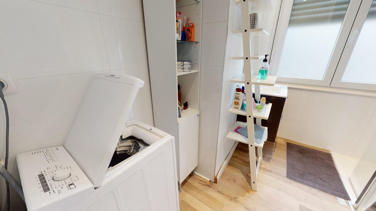 Une salle de bain avec une grande cabine de douche, un meuble vasque et une machine à laver ainsi que des WC séparés viennent compléter ce logement.