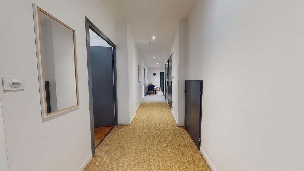 Cette colocation composée de cinq chambres dispose d’une pièce de vie équipée de canapés et rangements, d’une belle et grande cuisine proposant plaques, four, micro-ondes, réfrigérateur ainsi qu’une table à manger. L’appartement dispose également de deux toilettes complétées par trois salles de bain distribuées par un couloir, lui-même équipé d’un lave-linge. Les salles de bains communes sont chacune équipées d’un meuble vasque et d’une douche. Disposé au premier étage, l’appartement vous fera profiter d’une vue sur la Canebière depuis la pièce de vie.