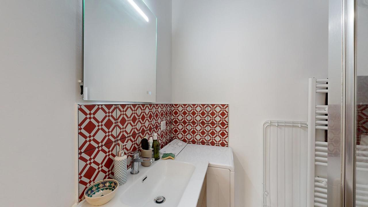 La salle d'eau dispose d'un meuble vasque, d'une douche, d'un lave-linge et de WC.