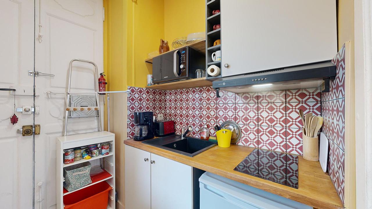 Ce T1 à la rénovation récente s'ouvre sur une cuisine équipée d'un réfrigérateur, d'un micro-ondes, de plaques de cuisson, d'une hotte, d'un évier, d'une table avec 3 chaises et de rangements.