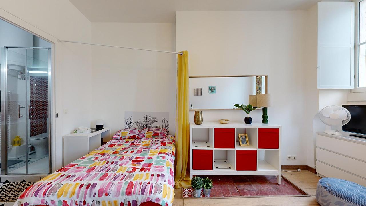 La pièce de vie est baignée de lumière grâce à deux grandes fenêtres, elle dispose d'un canapé, d'une table basse, d'une TV, d'un bureau, d'un lit double et de nombreux rangements, le parquet apporte une ambiance chaleureuse à l'ensemble.