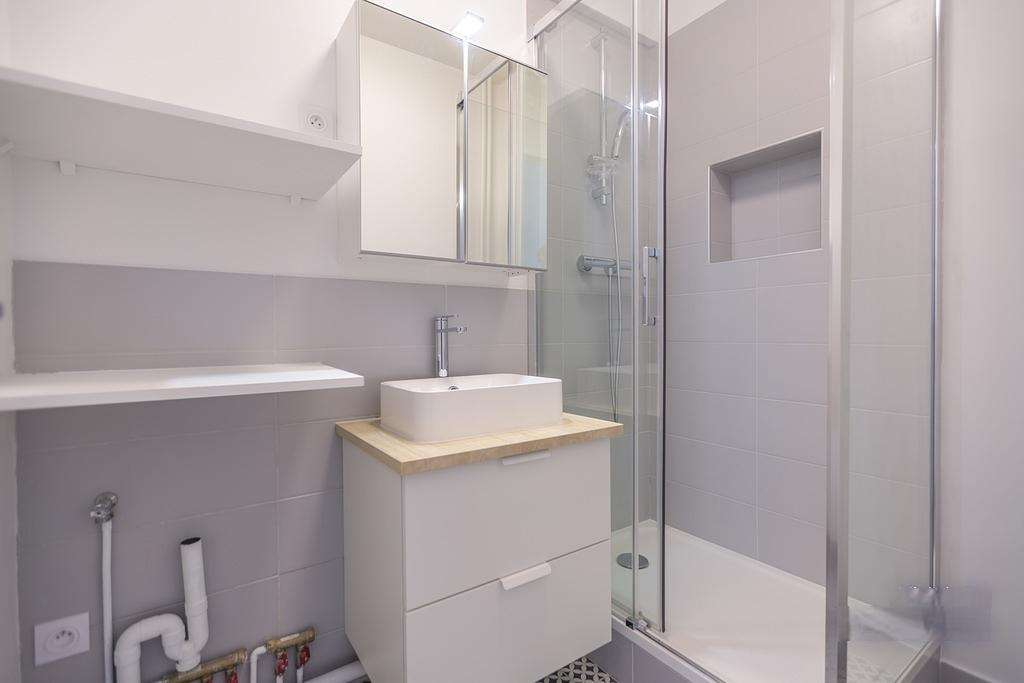 La salle d’eau comporte une douche, un meuble vasque avec miroir ainsi que des rangements. Les WC sont séparés.
