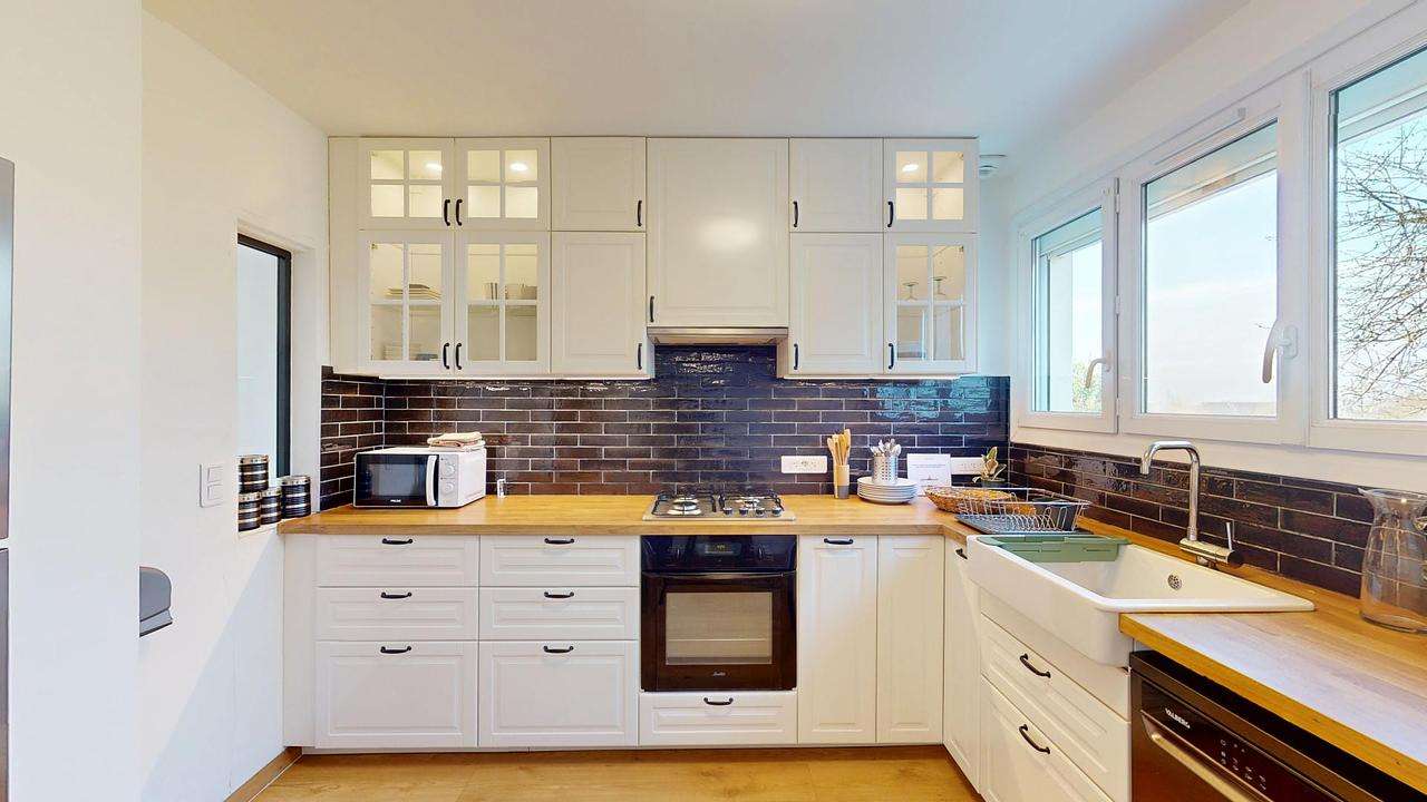 La cuisine séparée est entièrement équipée pour répondre à tous vos besoins du quotidien. Vous y trouverez un four, des plaques de cuisson, une hotte, un évier, un réfrigérateur avec compartiment congélateur, un lave-vaisselle ainsi que de nombreux rangements et ustensiles de cuisine.