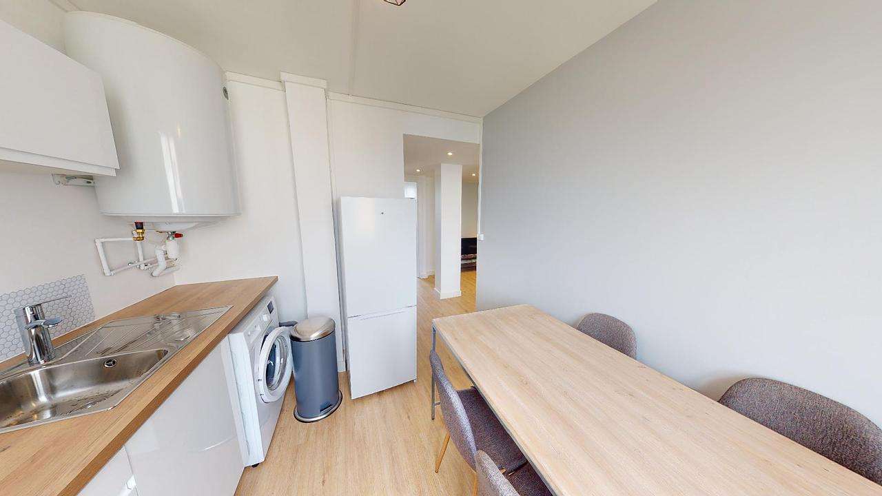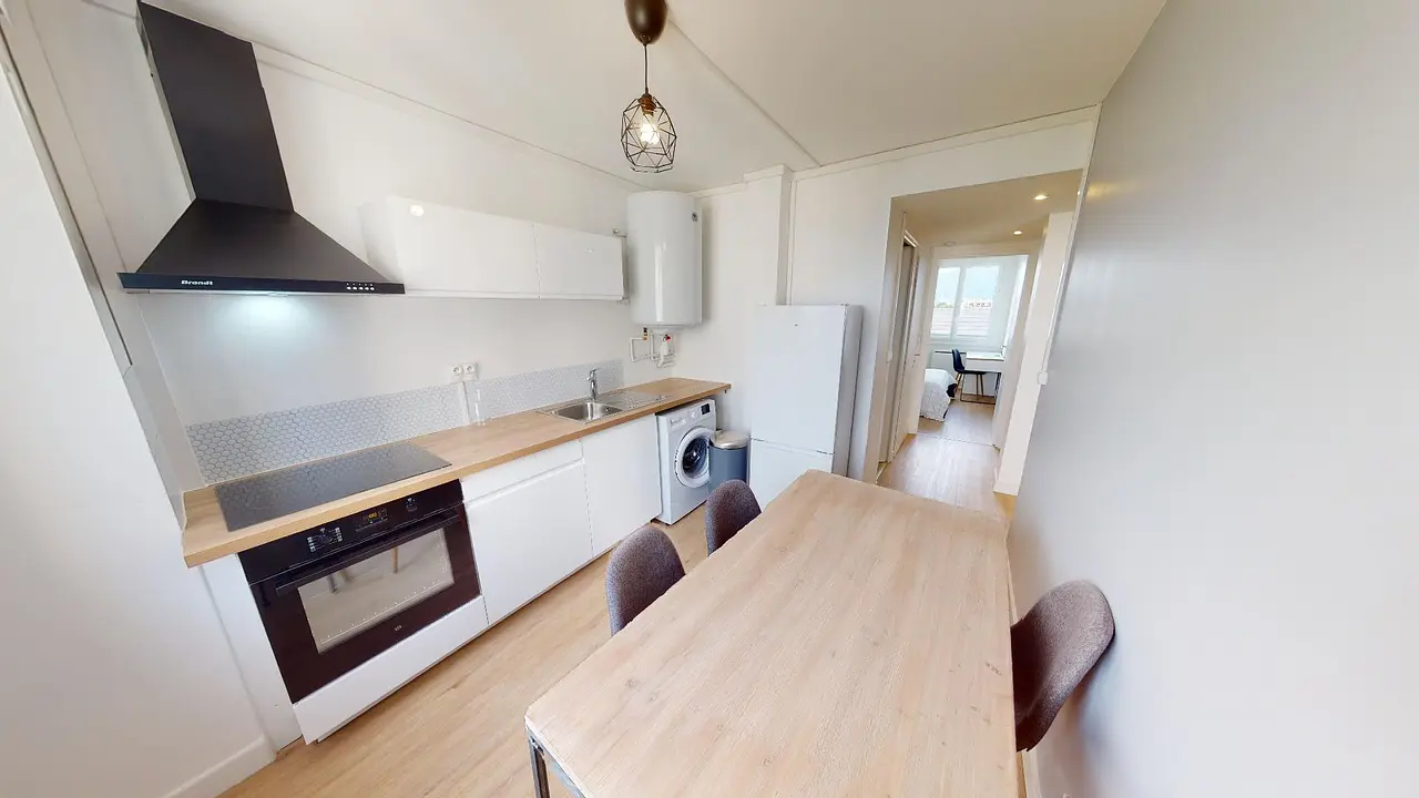 La cuisine entièrement rénovée est équipée avec un four, quatre plaques à induction avec une hotte, un évier, un réfrigérateur avec congélateur, une poubelle et une machine à laver. Cette pièce offre également un table avec quatre chaises, idéal pour partager des repas entre colocataires.