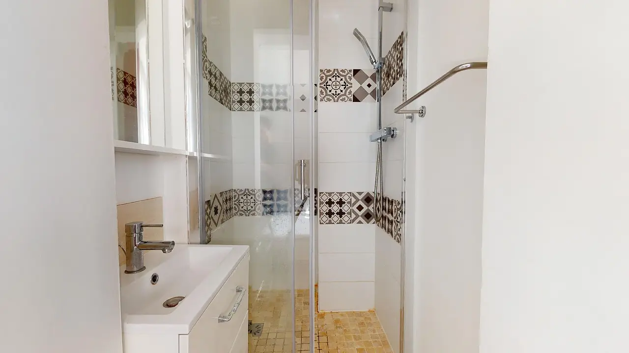 La salle de bain commune est équipée d’un meuble vasque et d’une douche.