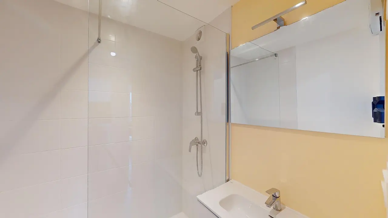 La salle d'eau est équipée d'un meuble vasque et d'une douche, et il y a également des toilettes séparées.