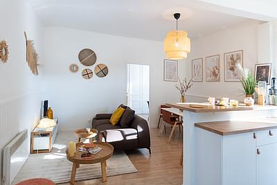 On entre dans la colocation par la cuisine équipée, et ouverte sur le salon. On aime le côté comptoir avec les tabourets de bar qui offre en plus un grand plan de travail, beaucoup d’espace de rangement dans les meubles bas. Le coin salon est cosy (large table basse, pouf et canapé), la déco chaleureuse. Ambiance coliving. Du salon on accède à une première chambre, tandis que 2 marches nous élèvent vers le couloir qui conduit aux 2 autres chambres et à la salle de bain, au fond, où l’on trouvera notamment une machine à laver.