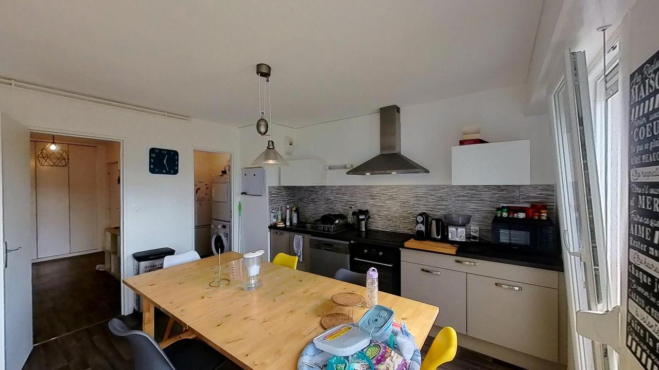 Une cuisine avec une table à manger et ses chaises, des plaques de cuisson, une hotte, un four, un lave-vaisselle, un four micro-ondes, une machine à café et de nombreux rangements. Deux portes-fenêtres, qui donnent sur un garde-corps, viennent donner de la luminosité à cet espace.