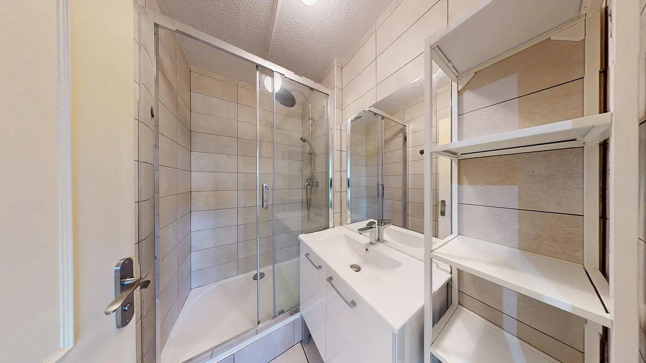 La seconde comprend une douche, un meuble vasque avec miroir, ainsi qu'un lave-linge et un sèche-linge pour votre confort.