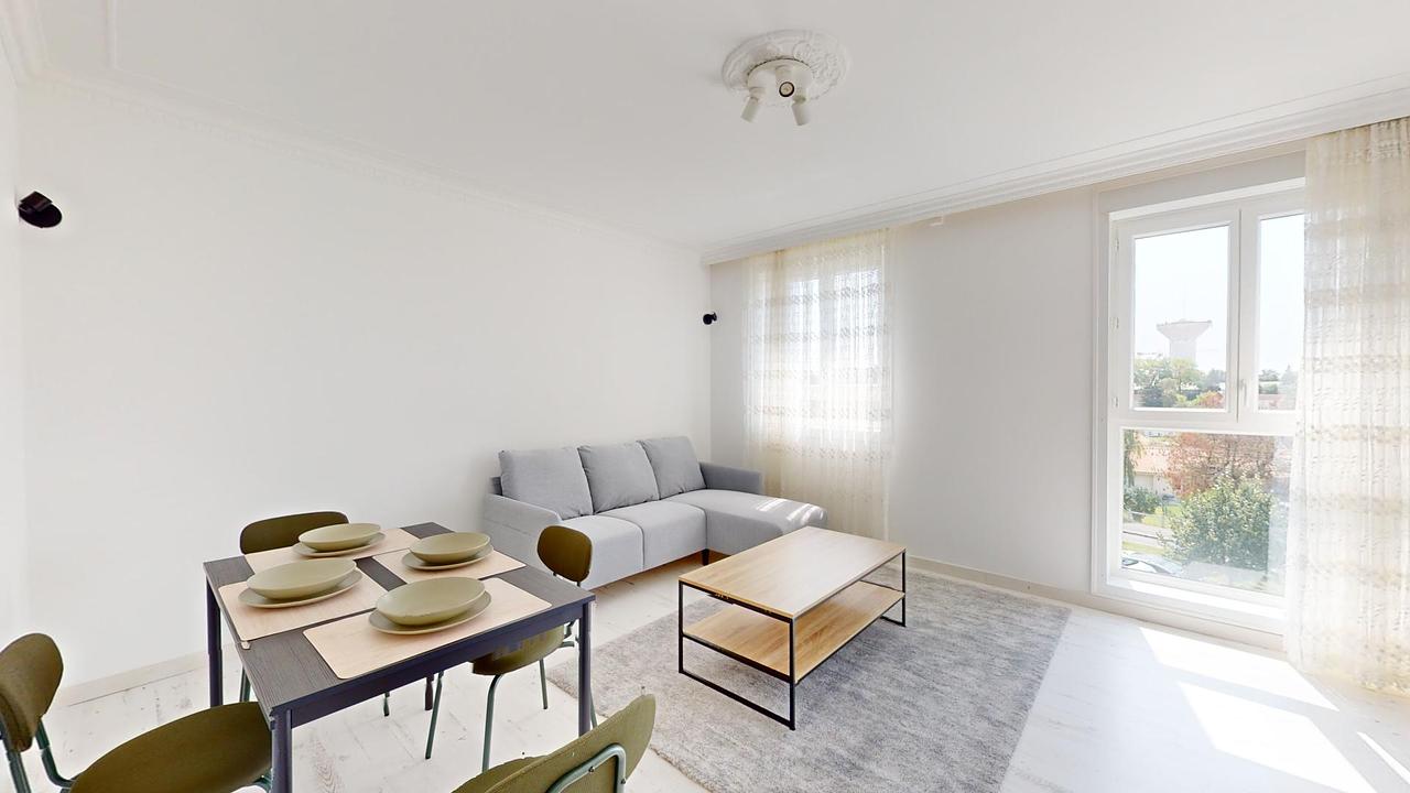 Un vaste salon vous attend, parfaitement aménagé avec un canapé, une table basse, une table à manger avec ses quatre chaises et un meuble TV avec une télévision. Un espace idéal pour se détendre ou recevoir vos invités. Les espaces de vie sont baignés de lumière naturelle grâce à deux grandes fenêtres, vous offrant un coin agréable et ensoleillé.