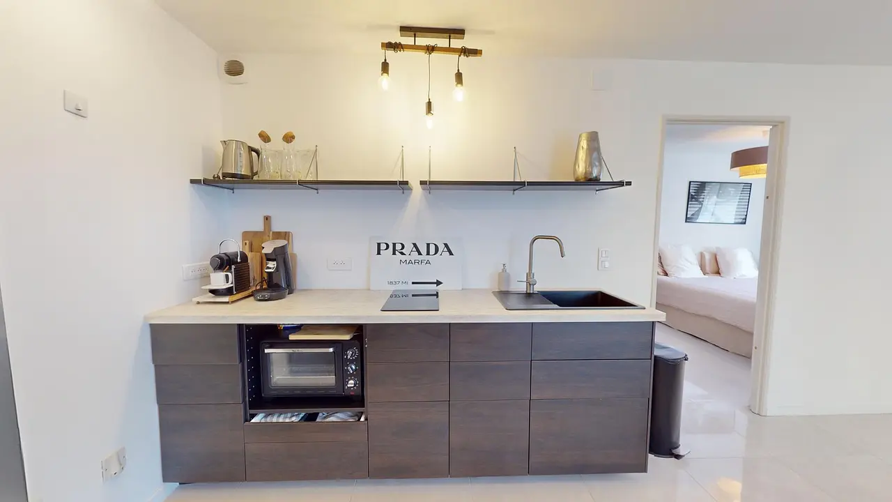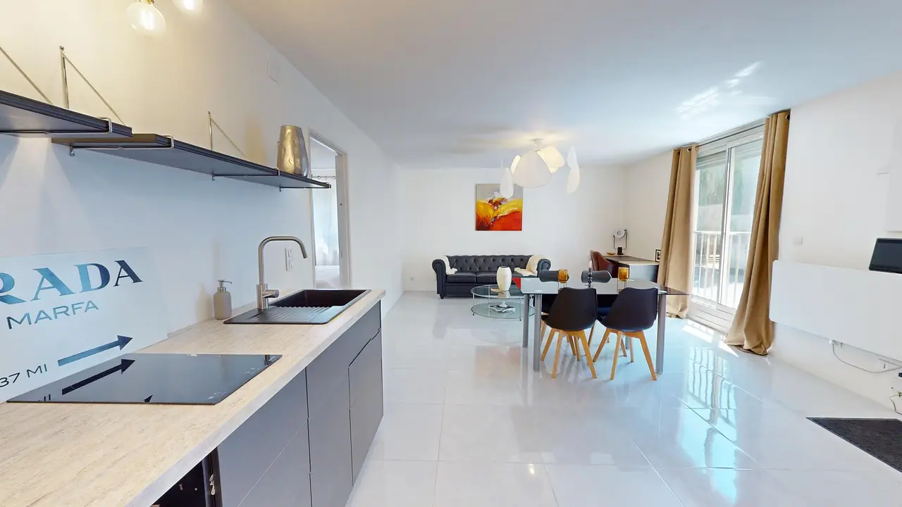 Profitez d'une cuisine ouverte sur le salon, équipée d'une table à manger avec quatre chaises élégantes. Cette cuisine moderne inclut un réfrigérateur, des plaques de cuisson, un micro-ondes et une machine à café. De nombreux rangements sont à votre disposition pour une organisation optimale.