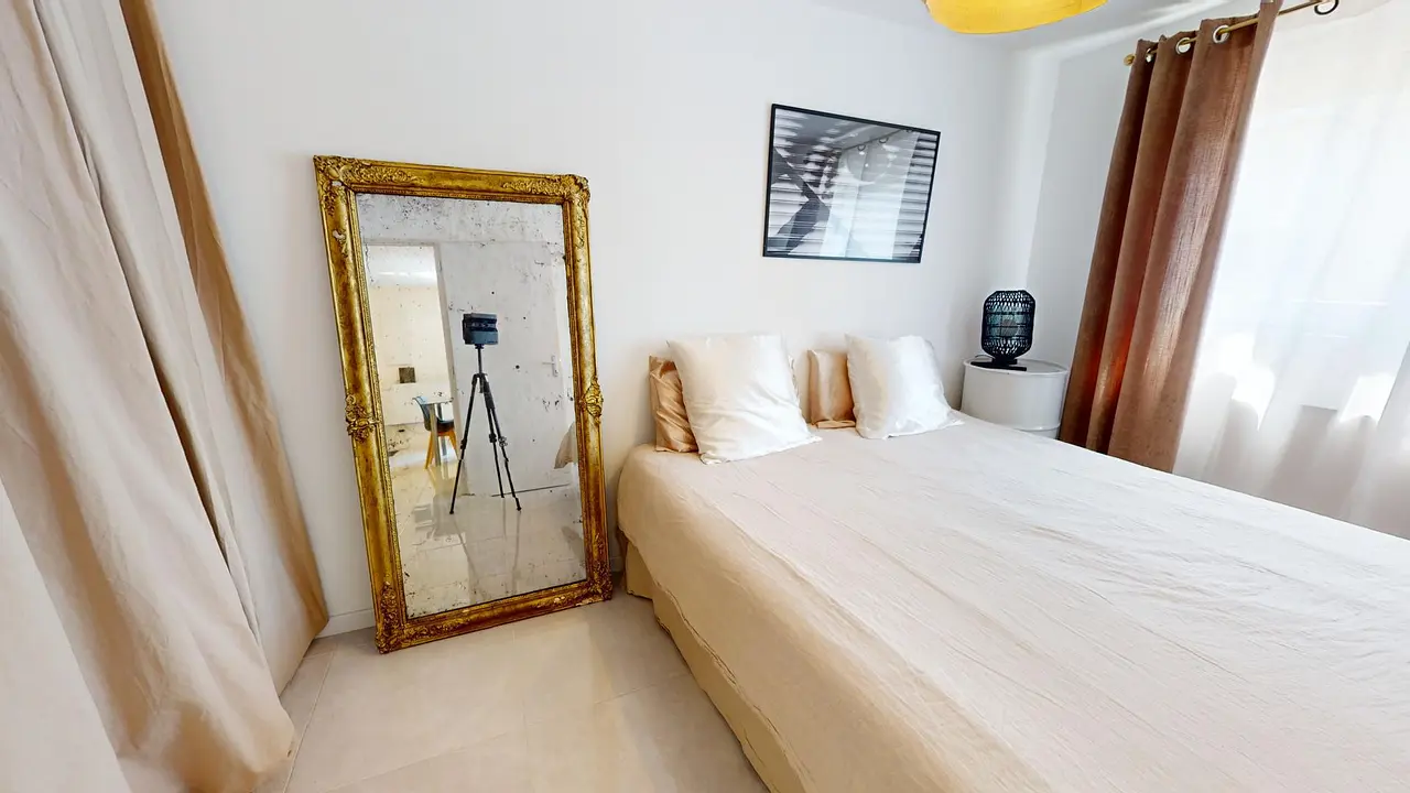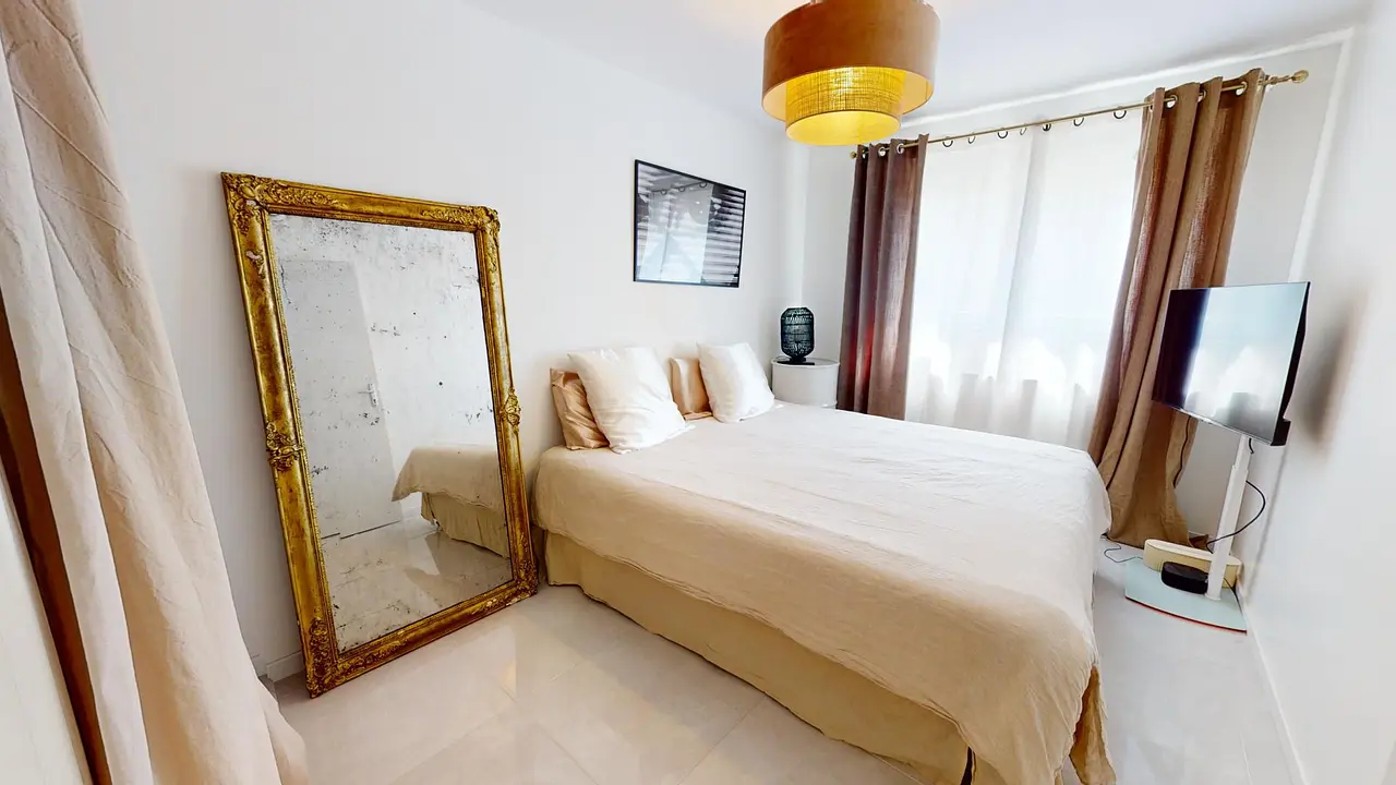 Cet appartement propose une superbe suite parentale avec un lit double, un grand miroir et une télévision. La salle de bain moderne est dotée d'une baignoire, d'un meuble vasque, d'une machine à laver, d'un WC et de nombreux rangements. Cet espace bénéficie d'une luminosité exceptionnelle grâce à une grande fenêtre.