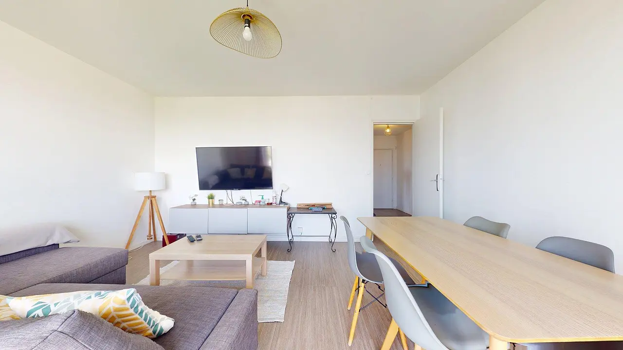 Le séjour, spacieux et lumineux, est aménagé d'un canapé d'angle, d'une table basse, d'un meuble TV avec une télévision, ainsi que d'une table avec cinq chaises, idéal pour partager des repas entre colocataires.