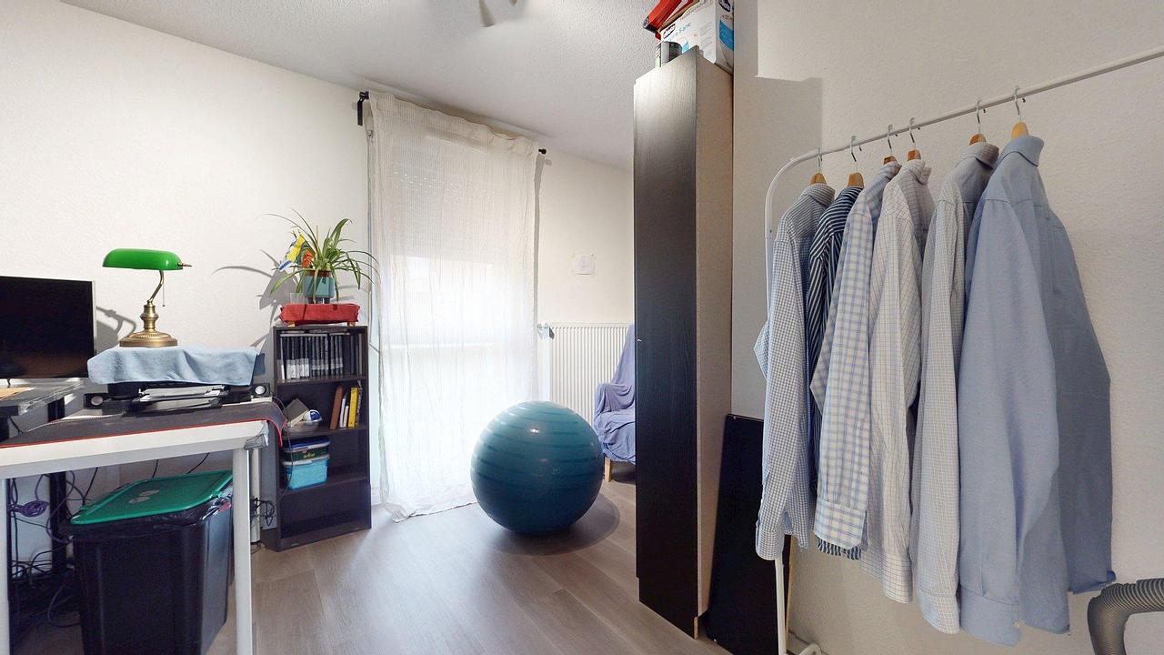 La troisième chambre, aménagée avec un bureau et des étagères. Elle peut être transformée selon vos besoins : chambre d’amis ou espace de travail.