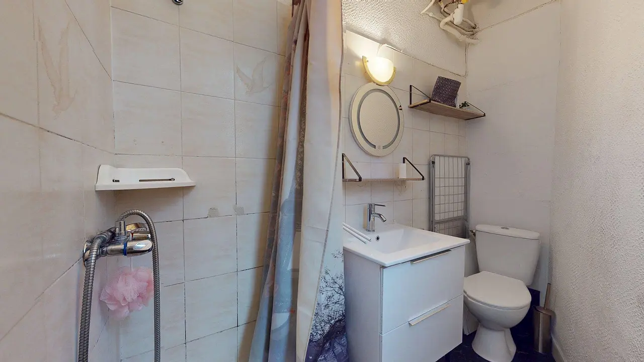 La salle d’eau est fonctionnelle et moderne : elle comprend une douche, un meuble vasque avec miroir, un WC intégré et des rangements astucieux pour garder l’espace organisé.