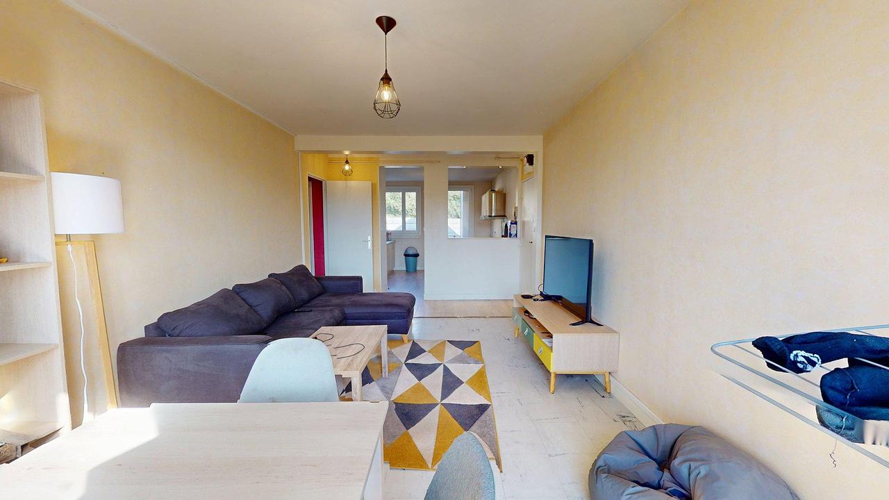 Cette colocation de quatre chambres s'ouvre sur une grande pièce de vie spacieuse et lumineuse. Elle est aménagée d'un canapé d'angle, d'un pouf, d'une table basse, d'un meuble TV avec une télévision, d'une bibliothèque ainsi que d'une table avec quatre chaises.