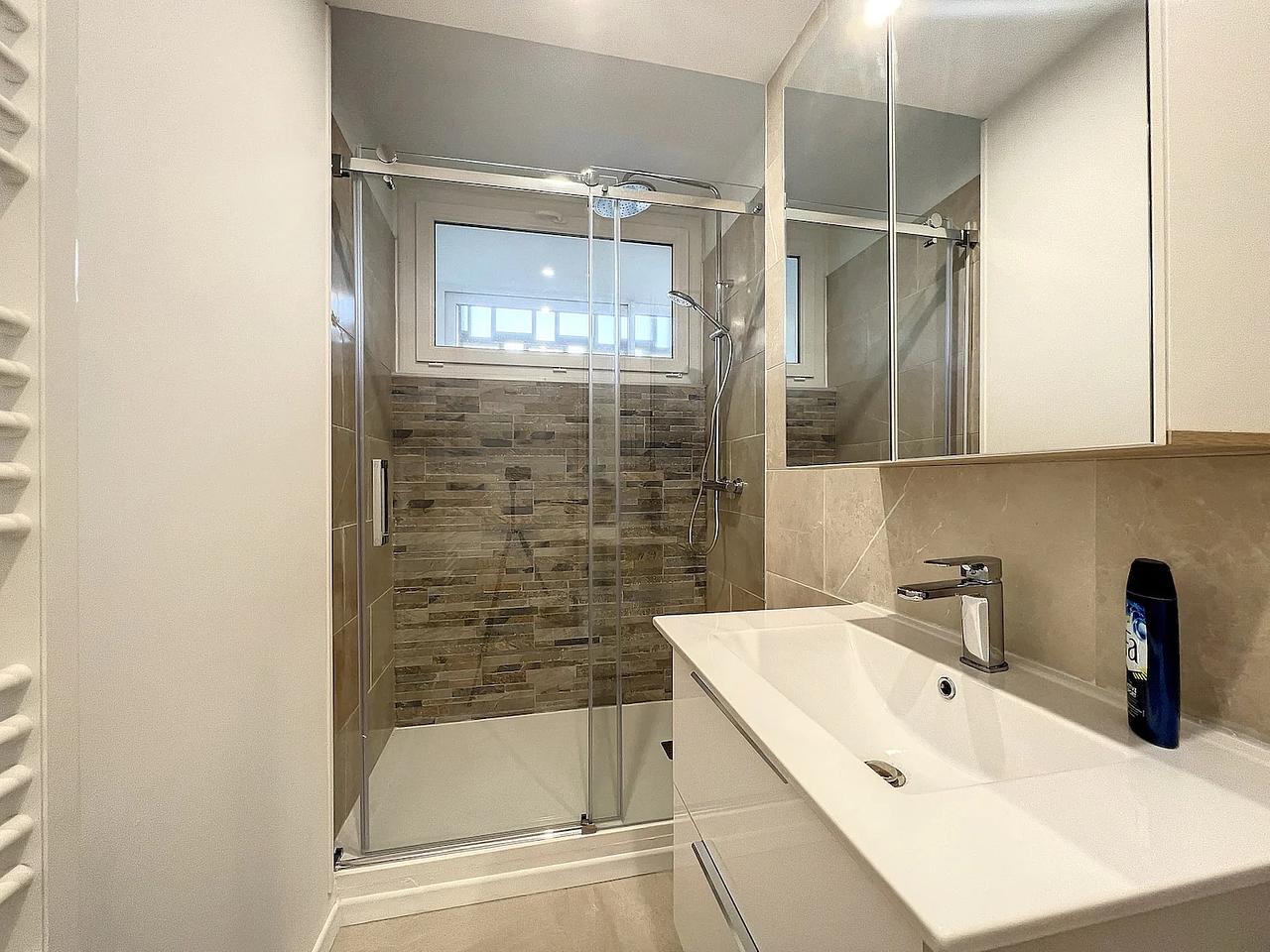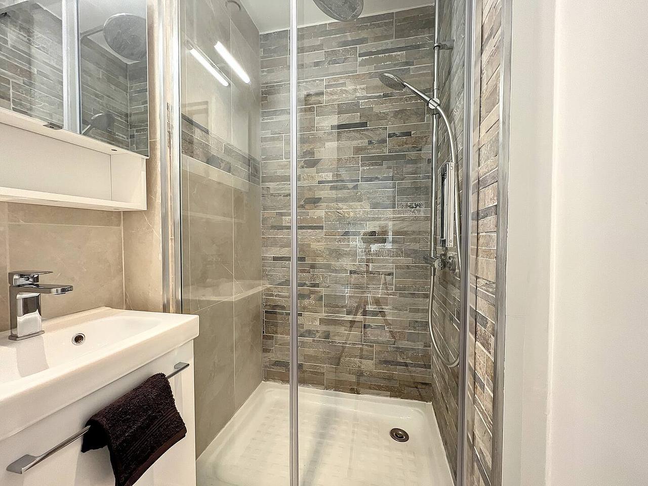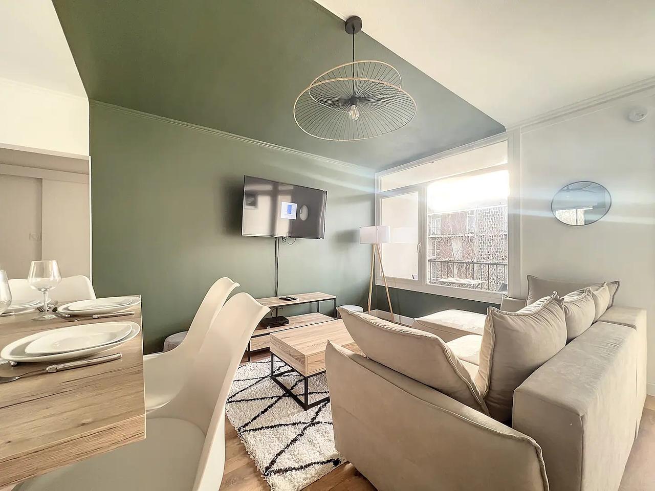 rangements, etc.) et dispose d’une table haute accompagnée de cinq chaises de bar. Le salon dispose d’un canapé, d’un tapis, d’un lampadaire, d’une table basse, d’un meuble TV et d’une grande TV murale. Un balcon muni d’une table et de deux chaises vient compléter ces espaces. Les deux salles de bain sont communes et disposent toutes les deux d’un meuble vasque et d’une douche.