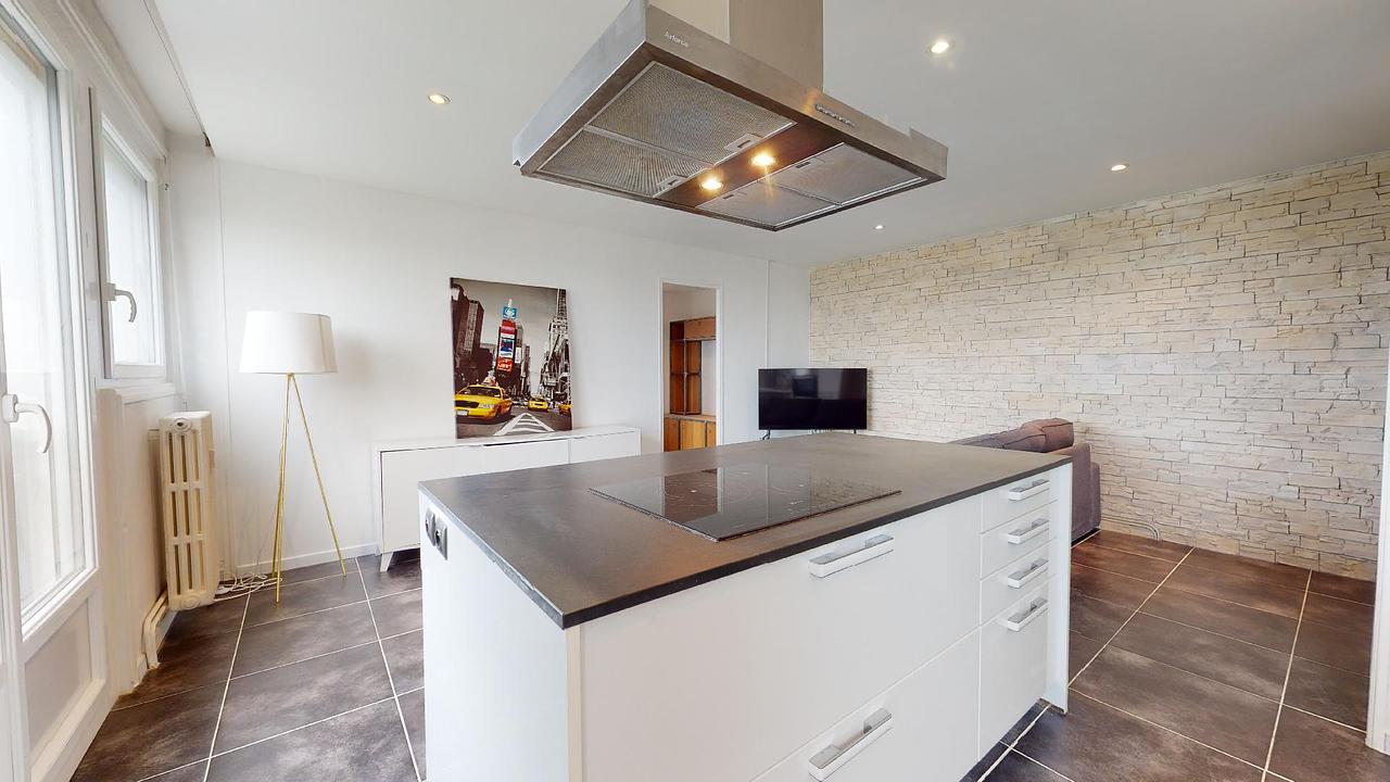Dès l’entrée, vous entrerez dans une lumineuse pièce de vie. Elle à été équipée d’une cuisine intégrée et ouverte sur un espace salon (Muni d’un canapé d’une table basse, d’une TV, d’un tapis, d’un meuble de rangement, et d’un lampadaire). Cette cuisine dispose d’un ilot de travail, avec 4 plaques électrique et une hotte, et s’équipe d’un four, d’un micro-onde, ainsi que de nombreux placards de rangement. Enfin, vous disposerez d’une buanderie pour effectuer vos lessives.