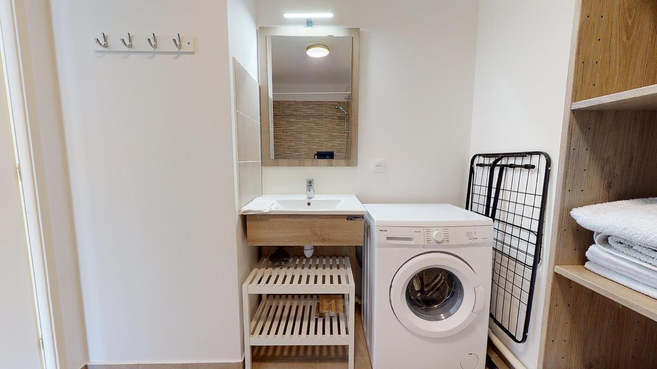 Deux salles de bain, une avec douche et meuble vasque et une avec baignoire, machine à laver, et WC ainsi que des WC séparés