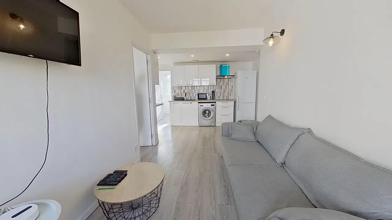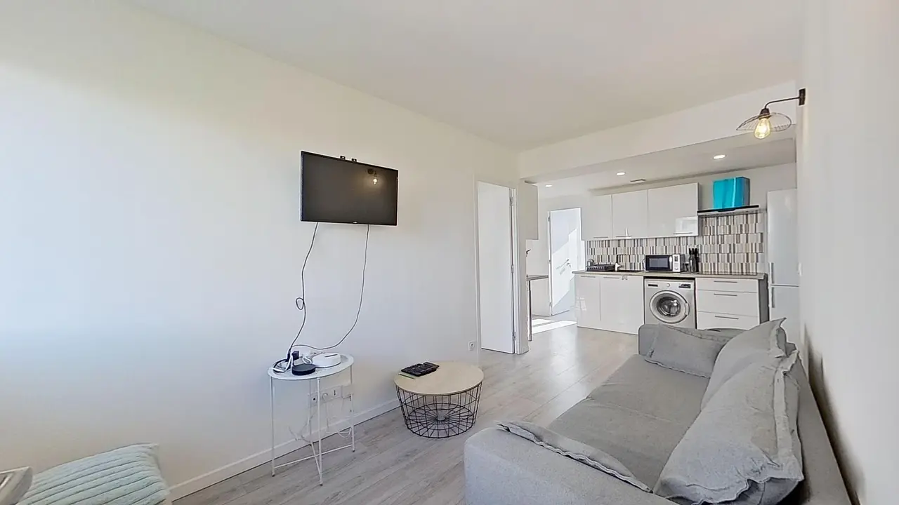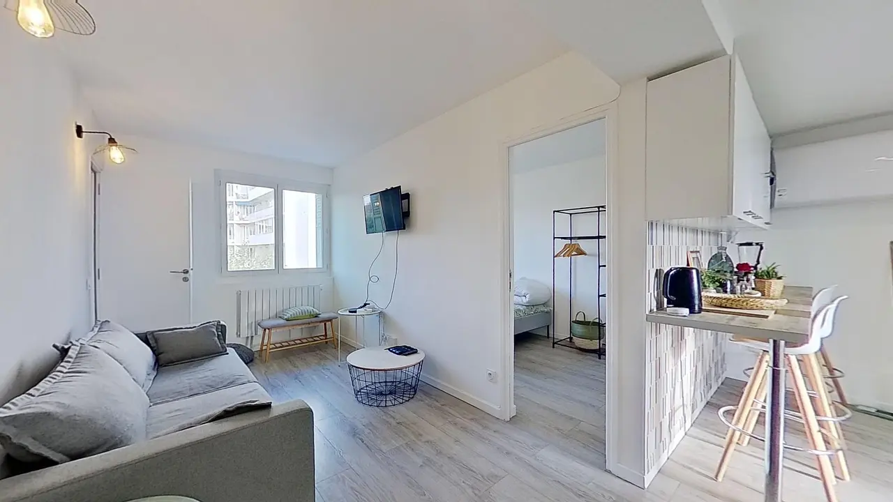 Cette colocation de trois chambres s'ouvre sur la pièce de vie avec la cuisine ouverte. Cette dernière est équipée d'un réfrigérateur avec congélateur, des plaques de cuisson avec une hotte, un micro-ondes, une bouilloire, un mixeur, un grille-pain, une machine à laver, un évier avec un égouttoir ainsi que de nombreux rangements. Un mange-debout avec quatre chaises hautes viennent compléter cette pièce. Le salon est aménagé d'un canapé, de deux tables basses, une banquette ainsi qu'une télévision.