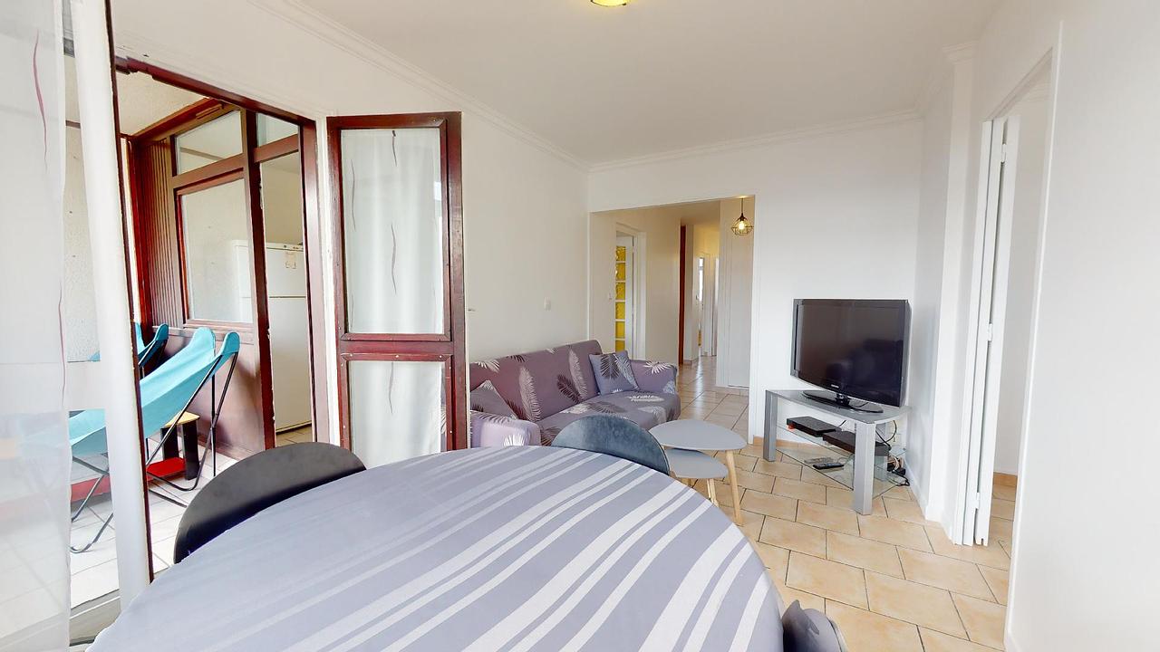 Le logement comporte un salon équipé d'un canapé, d'un meuble TV et d'une TV ainsi que de chaises et d'une table.