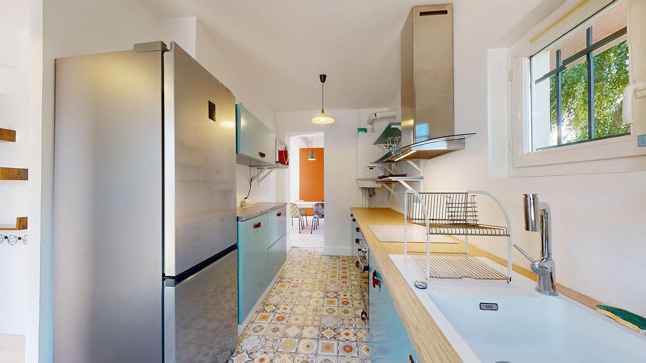 La cuisine est équipée d'un four, d'un micro-ondes, d'un réfrigérateur avec congélateur, de plaques de cuisson avec une hotte ainsi que de nombreux rangements.