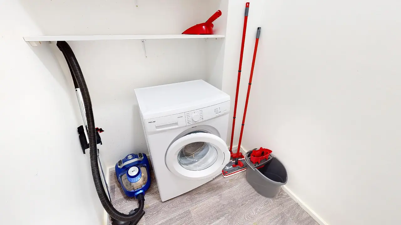 Une machine à laver et des rangements sont présents dans l’espace buanderie.