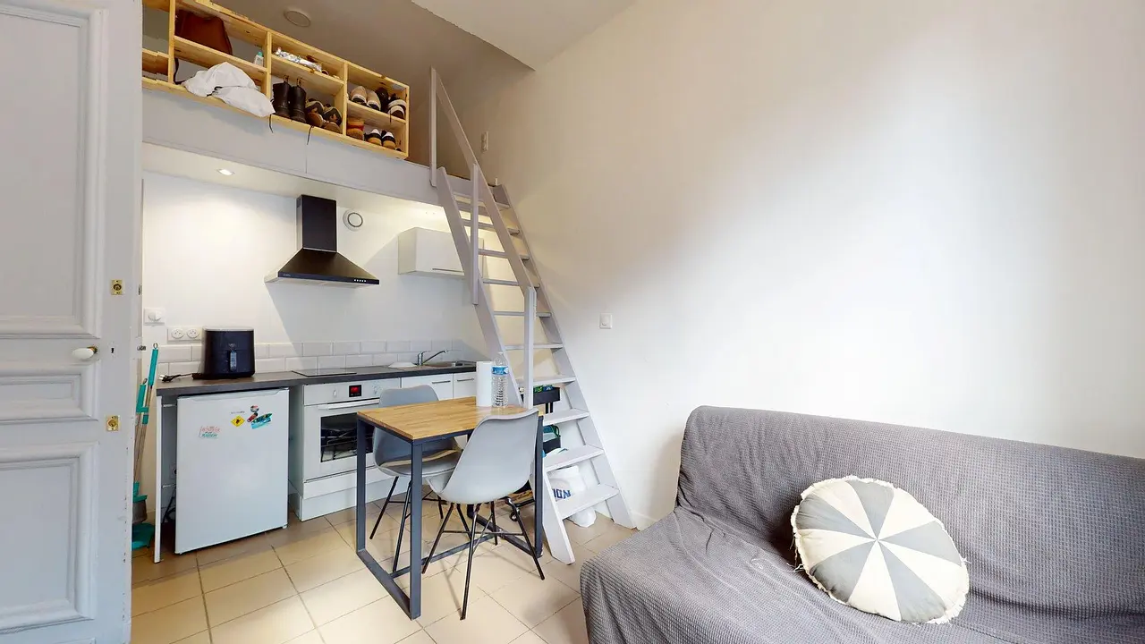 Le studio se compose d’un espace de vie lumineux avec un coin salon aménagé d’un canapé et d’une table basse, ainsi qu’un coin repas. La cuisine ouverte est équipée de plaques de cuisson, d’un four, d’une hotte et d’un réfrigérateur, avec des rangements pratiques.